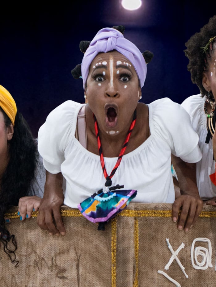 No elenco, três atrizes se encarregam de concretizar as histórias: Adriana Fonseca, arte educadora, produtora cultural, atriz e autora do projeto Contorixás; Jéssica Castro, atriz, arte educadora e instrutora de danças africanas; Simone Cerqueira, atriz, produtora cultural e cria de Nova Iguaçu.