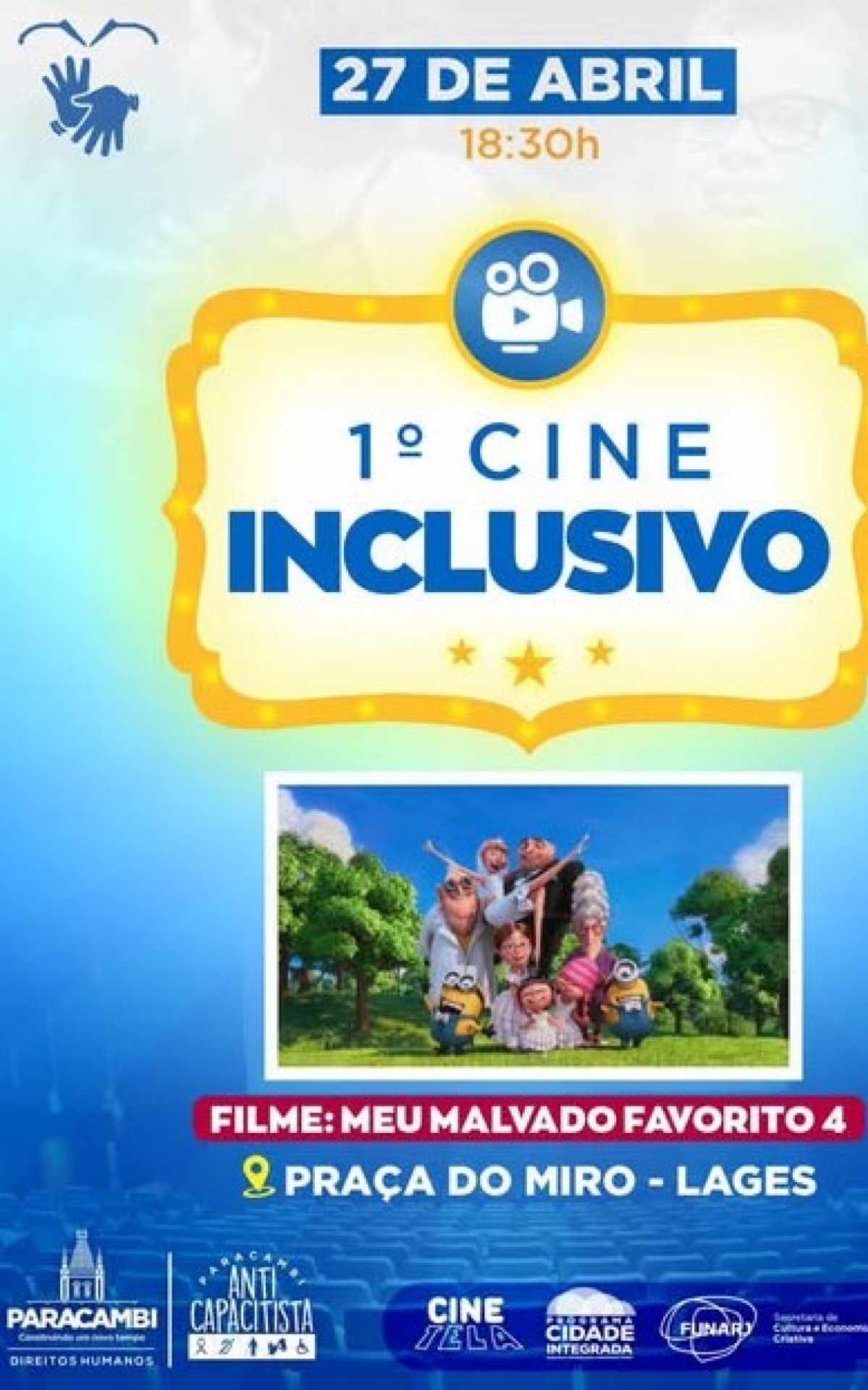 Paracambi - No próximo domingo (27), a Prefeitura de Paracambi promove o 1º Cine Inclusivo, com a exibição gratuita do filme “Meu Malvado Favorito 4”, na Praça do Miro, em Lages, às 18h30.
