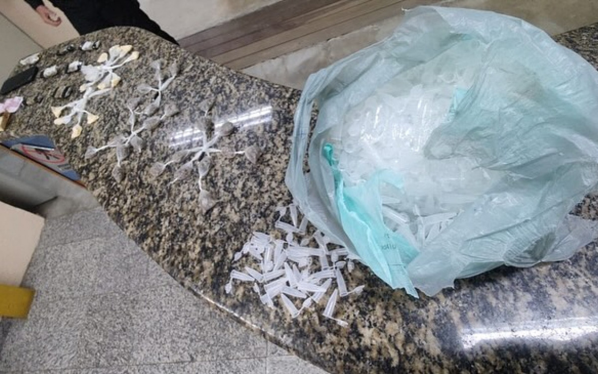 Após receberem denúncias, os agentes foram a um imóvel e realizaram buscas, encontrando 32g de maconha, 14g de cocaína, 200 pinos vazios para endolação, um celular e R$ 55 em espécie.