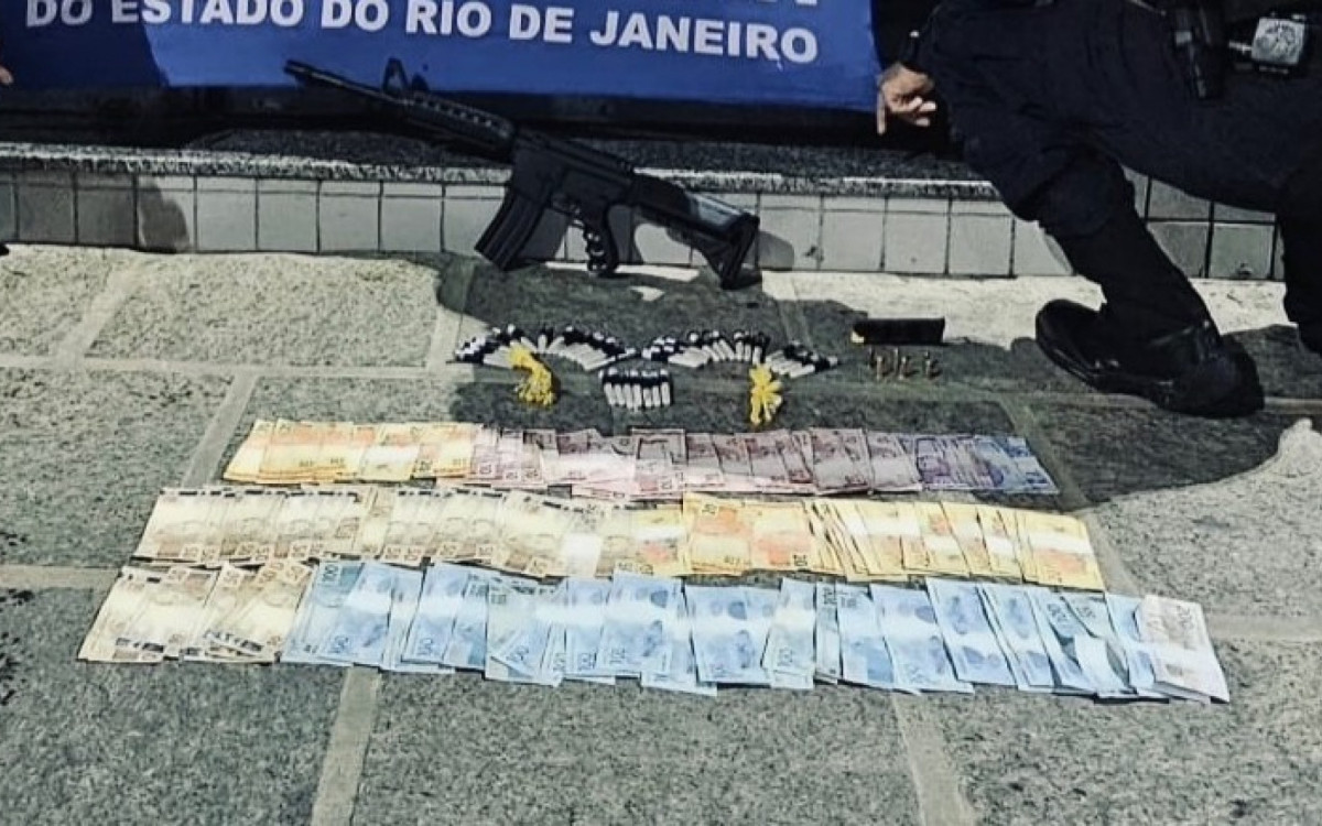 No local, o 38º BPM apreendeu uma réplica de fuzil, um carregador, 38 pinos de cocaína, 13 pedras de cracl e R$ 5.480,00 em espécie.
