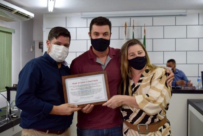 O gesto foi realizado no plenário da Casa Legislativa e contou com a presença dos vereadores e funcionários essenciais para a realização da reunião ordinária. A presença do público segue restrita. Na oportunidade, o autor enalteceu a trajetória dos empreendedores e parabenizou a atuação do casal em meio ao período de crises gerada pela pandemia. “Elderson e Eliane possuem uma história muito bonita e de muito trabalho. Iniciaram na cozinha de casa, expandiram suas atividades comerciais pouco tempo depois e hoje já comemoram 15 anos de muita luta, perseverança e sucesso. Enfrentaram com coragem este difícil período de recessões e incertezas econômicas mas não deixaram de garantir o sustento dos seus funcionários e, consequentemente, de várias famílias da nossa cidade. São merecedores de todo reconhecimento e me sinto honrado em poder enaltecer pessoas tão queridas e motivo de grande orgulho para a nossa cidade”, destacou o vereador Diego.