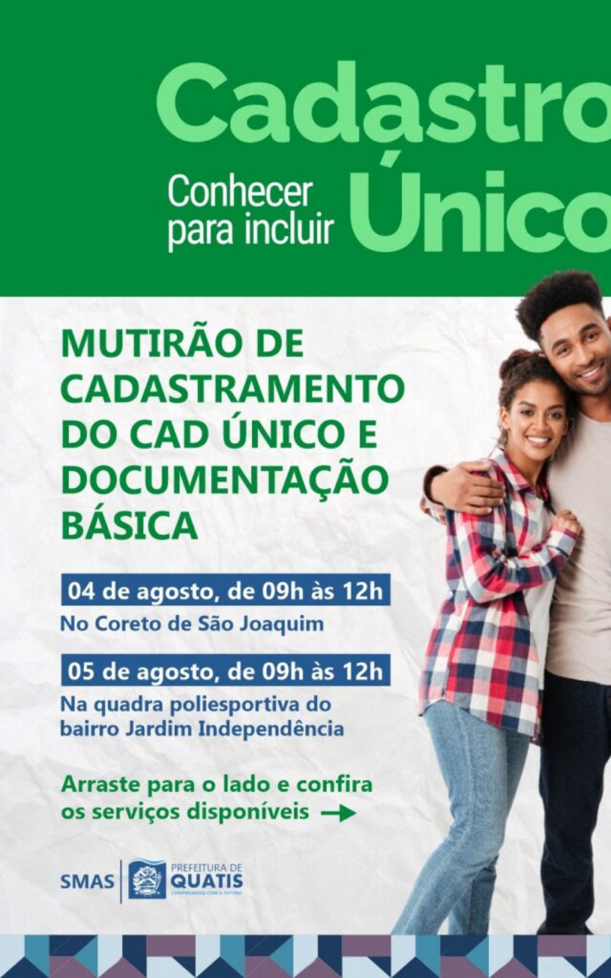 Quatis - A Prefeitura de Quatis vai promover, no próximo mês, um mutirão de cadastramento do CadÚnico para Programas Sociais. Nesta primeira etapa, a ação acontecerá no distrito de Ribeirão de São Joaquim, no dia 4, no coreto; e no bairro Jardim Independência, no dia 5, na Quadra Poliesportiva da comunidade. O horário de atendimento é das 9h ao meio-dia. O objetivo, segundo a Secretaria Municipal de Assistência Social (SMAS), é garantir o acesso à documentação básica e oferecer informações sobre os programas sociais do Governo Federal para a população, como Cartão Melhor Idade, serviços do CRAS, NADBS, Cadastro Único, Fundação Leão XIII e serviços da Secretaria Municipal de Desenvolvimento Econômico Urbano e Rural.