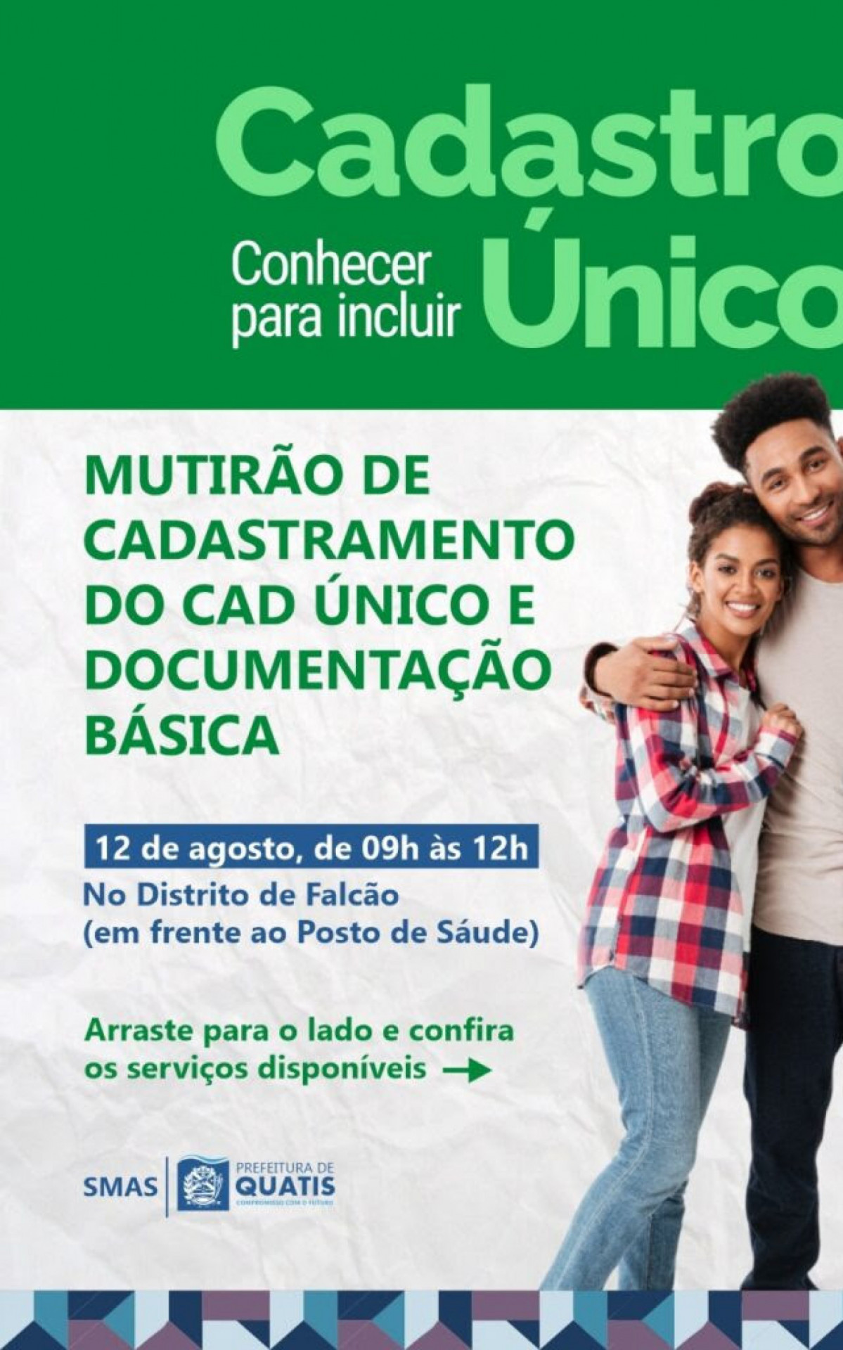 Quatis - O mutirão de cadastramento do CadÚnico para Programas Sociais está chegando no distrito de Falcão. A ação acontecerá na praça da comunidade, em frente à Unidade Básica de Sáude. O horário de atendimento é das 9h ao meio-dia. O objetivo é garantir o acesso à documentação básica e oferecer informações sobre os programas sociais do Governo Federal para a população, como Cartão Melhor Idade, serviços do CRAS, NADBS, Cadastro Único, Fundação Leão XIII e serviços da Secretaria Municipal de Desenvolvimento Econômico Urbano e Rural.