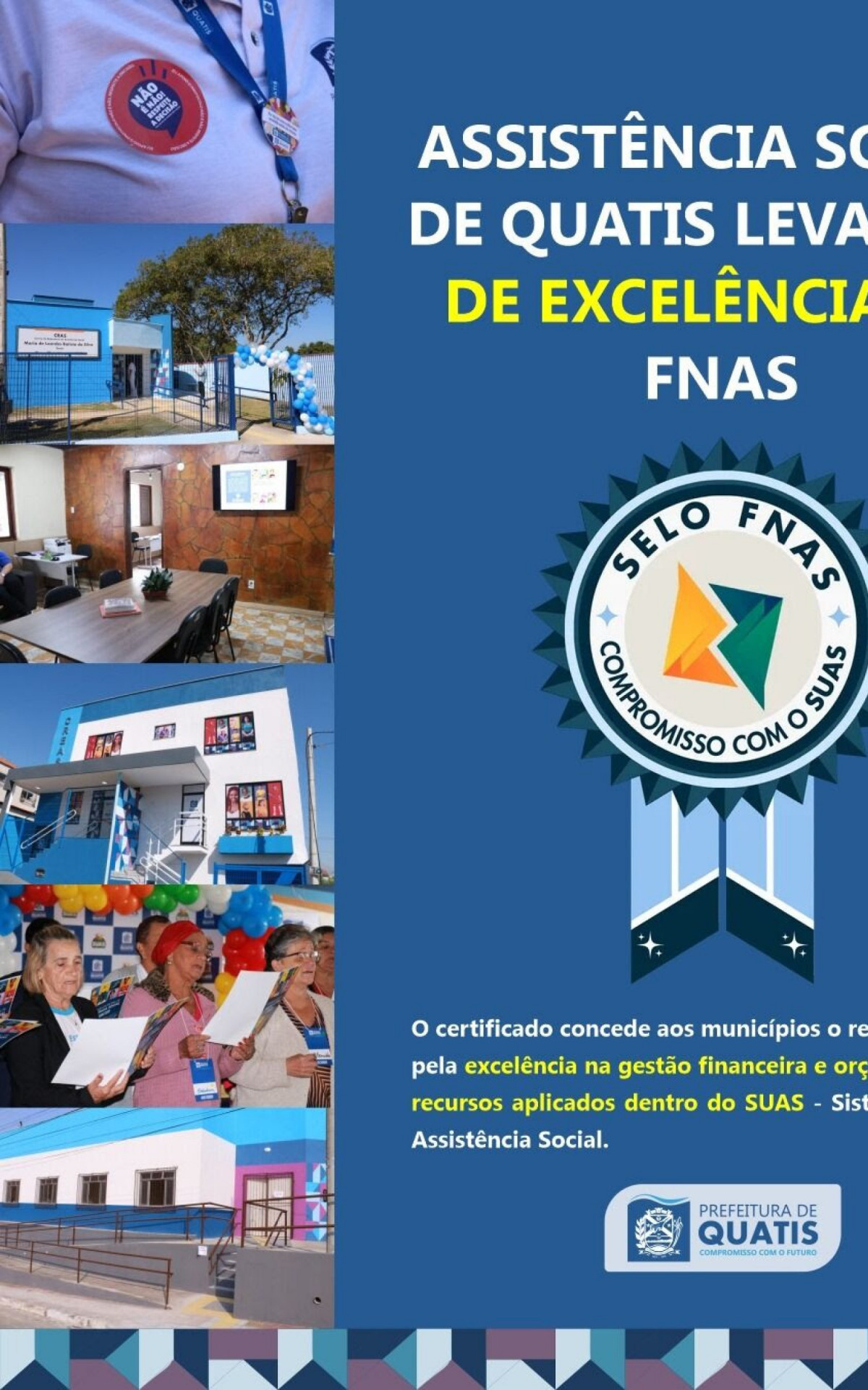 Quatis - O município de Quatis foi contemplado com o Selo de Excelência do Fundo Nacional de Assistência Social (FNAS), ligado ao Ministério do Desenvolvimento Social e Combate à Fome (MDS). O certificado reconhece municípios brasileiros pela excelência na gestão financeira e orçamentária dos recursos aplicados no Sistema Único de Assistência Social (SUAS).