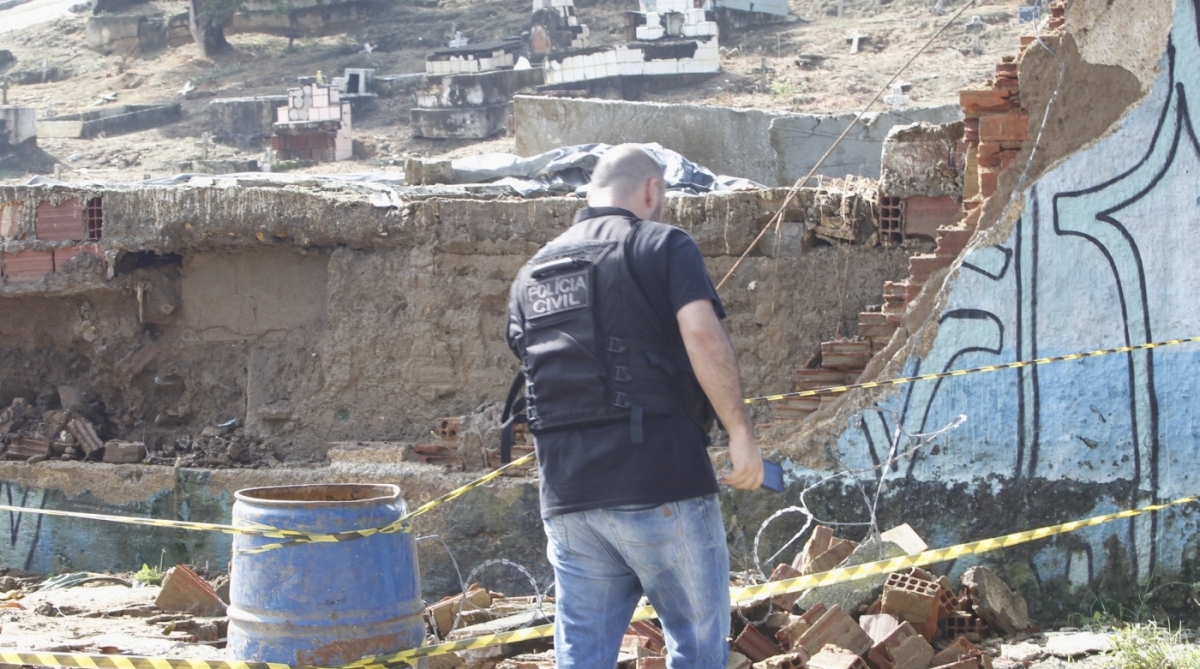 Rio - Policiais civis fazem uma perícia, na manhã desta quarta-feira, no Cemitério Nossa Senhora das Graças, em Duque de Caxias, na Baixada Fluminense, onde um muro desabou em um temporal. Por causa do alagamento, algumas ossadas foram arrastadas para ruas próximas do bairro Parque Beira Mar, nesta terça. Durante a noite, o caso foi acompanhado pelo subsecretário André Xavier. O local continua interditado pela Defesa Civil.