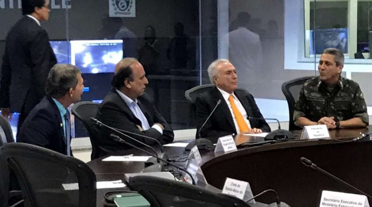 Rio - O presidente Michel Temer se reuniu com o governador Luiz Fernando Pezão e o interventor na segurança do Rio, general Walter Braga Netto, na noite desta quarta-feira. O encontro aconteceu no Centro Integrado de Comando e Controle (CICC) e também contou com a presença dos ministros da Segurança Pública, Raul Jungmann; da Defesa, general Joaquim Silva e Luna; e do Gabinete de Segurança Institucional, general Sérgio Etchegoyen.