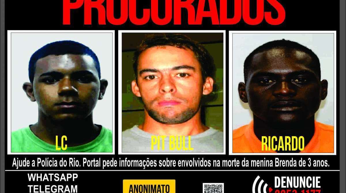 Rio - Foram divulgadas pela polícia nesta terça-feira as fotos dos procurados pela morte da menina Brenda Valentim Alves de Oliveira, de 2 anos, atingida por um tiro na cabeça, em 31 de março, no distrito de Conceição de Jacareí, em Mangaratiba, na Costa Verde do Rio. Um cartaz criado pelo Portal dos Procurados, do Disque Denúncia, mostra Lucas Honório dos Reis, o LC, de 23 anos, Vitor Aguiar de Araújo, o Pit Bull, de 37, e Ricardo dos Santos, de 25, principais suspeitos de participação na morte da criança.
