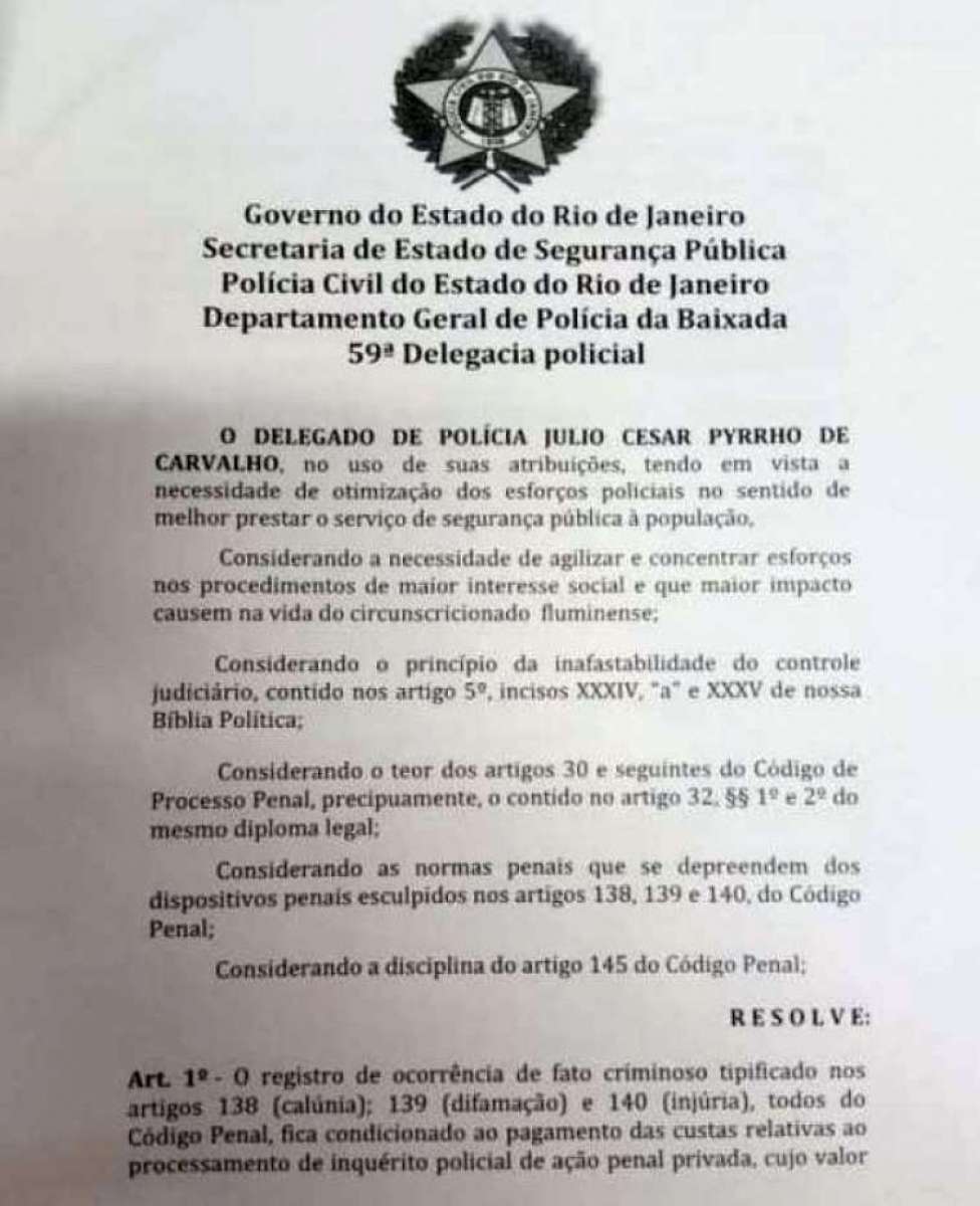 "O registro de ocorrência de fato criminoso tipificado nos artigos 138 (Calúnia), 139 (difamação) e 140 (injúria) fica condicionado ao pagamento das custas relativas ao processamento de inquérito policial de ação penal privada", determina a portaria assinada pelo delegado Carvalho, cujo texto afirma que a medida é para "melhor prestar o serviço de segurança pública à população".