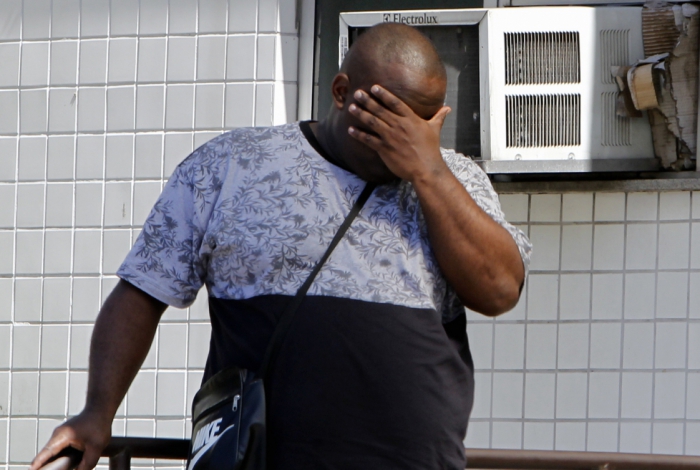![Parentes de mais uma vitima de bala perdida.Edna Palafoz de Oliveira foi atingida por uma bala durante um comfronto na favela de antares Zona Oeste do Rio,familiares no IML [centro] Daniel Campos esposo, esquerda sogro Manoel Campos