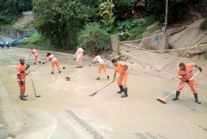 A remoção do material que chegou à pista é feita pela Comlurb, que usa garis, uma pá carregadeira, três caminhões basculantes e três caminhões pipa. A prefeitura disse, por volta das 9h30, que ainda há outros equipamentos sendo enviados ao local.