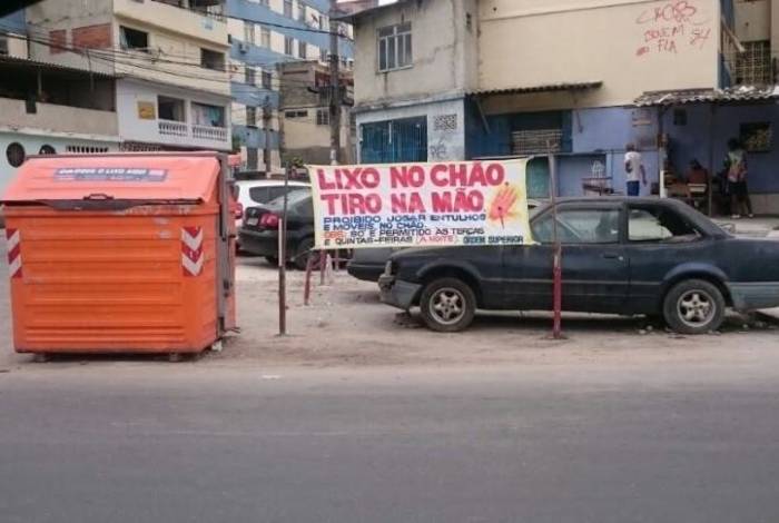 Em faixa colocada no Complexo do Alemão, traficantes ameaçam moradores a varrer 300 metros caso lixo seja descartado em local irregular
