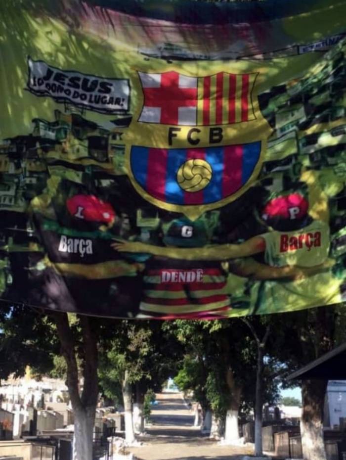 Na entrada do cemitério, uma bandeira com a frase "Jesus é o dono do lugar" e o escudo do BarcelonaReprodução / Internet