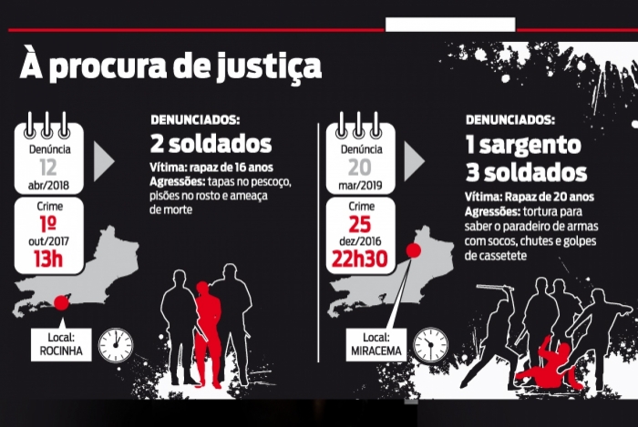 Os outros casos de tortura em que o MP já pediu a condenação dos agentes, desde a mudança da lei, ocorreram em Itaperuna e Miracema, Noroeste Fluminense; e na comunidade da Rocinha, Zona Sul do Rio. No da Rocinha, um jovem, de 16 anos, foi a vítima, em outubro de 2017. Ele relatou que estava andando nas ruas da comunidade e portava R$ 80 em sua carteira, quando dois soldados o revistaram. Além de roubar o dinheiro, os agentes o acusaram de ser traficante e o espancaram para saber a localização de drogas e armas.