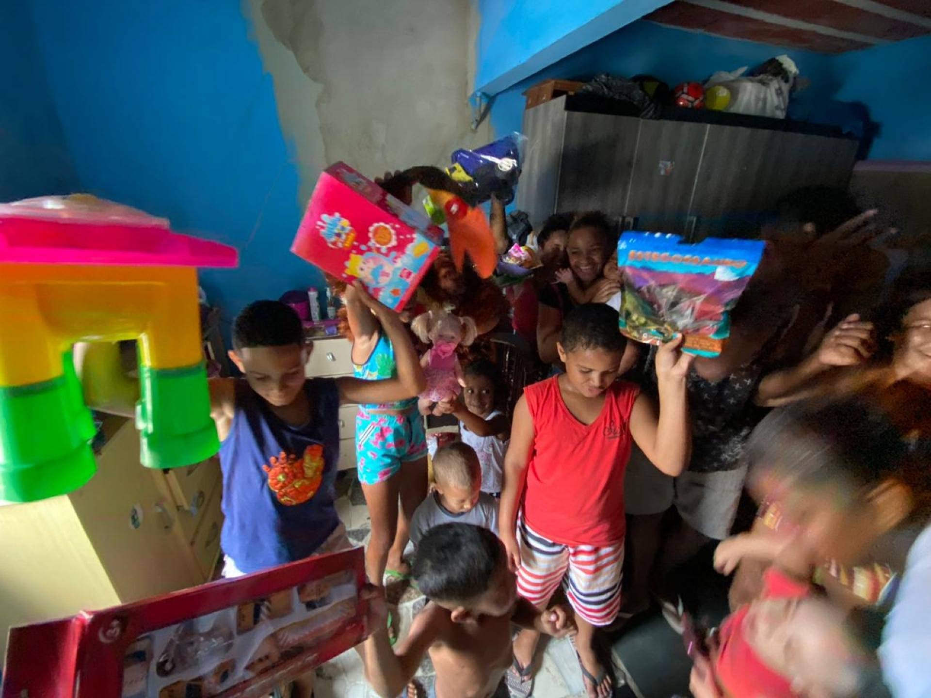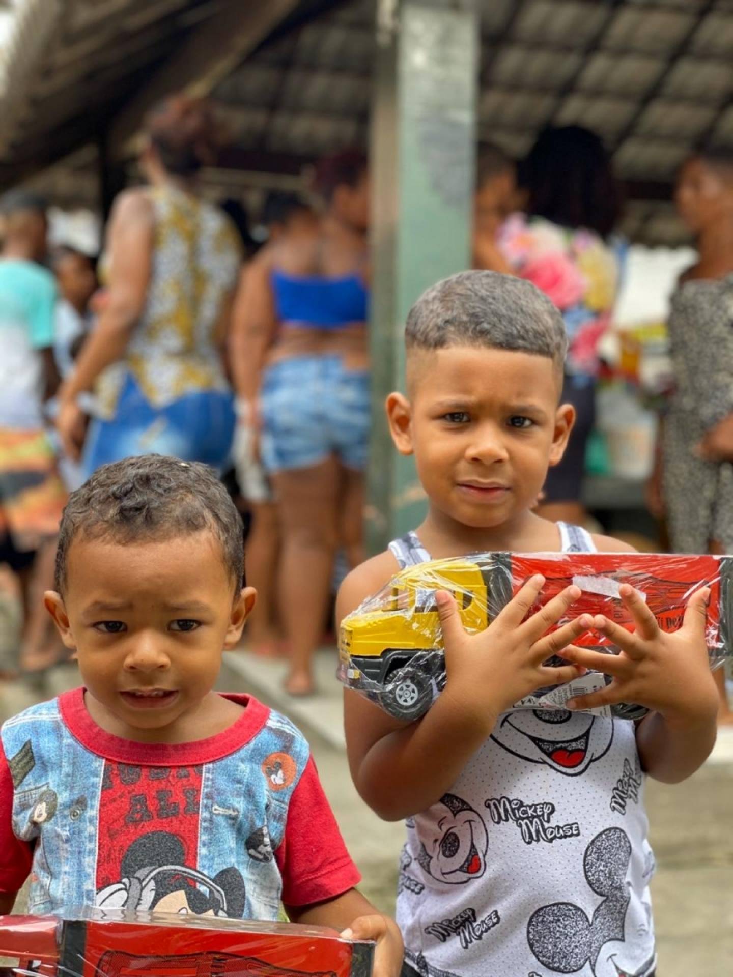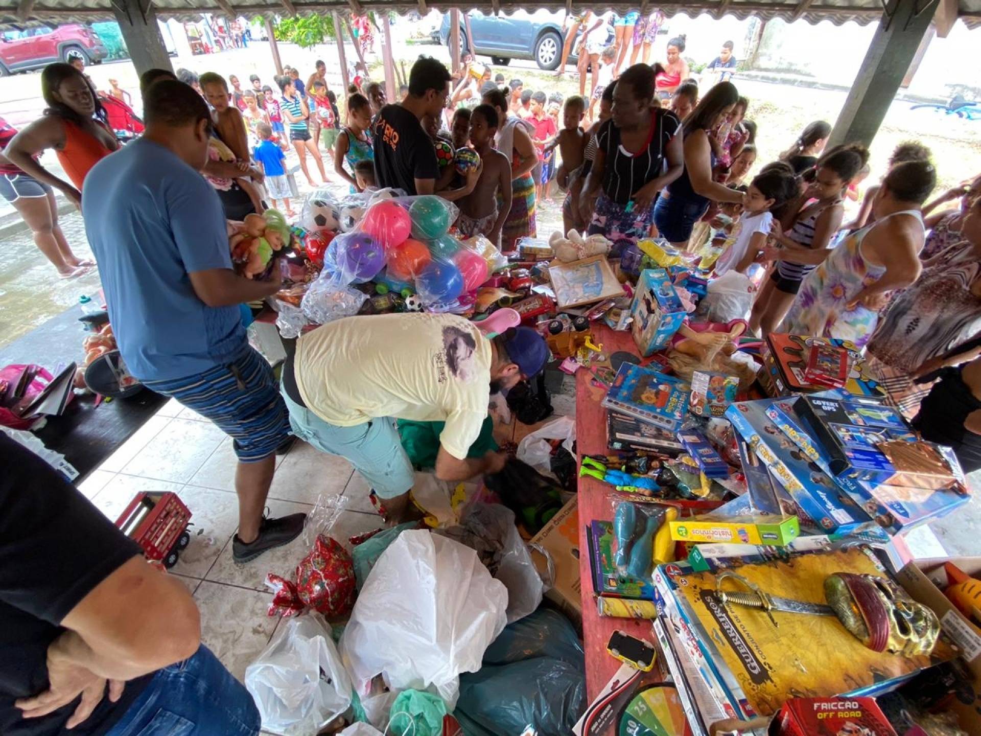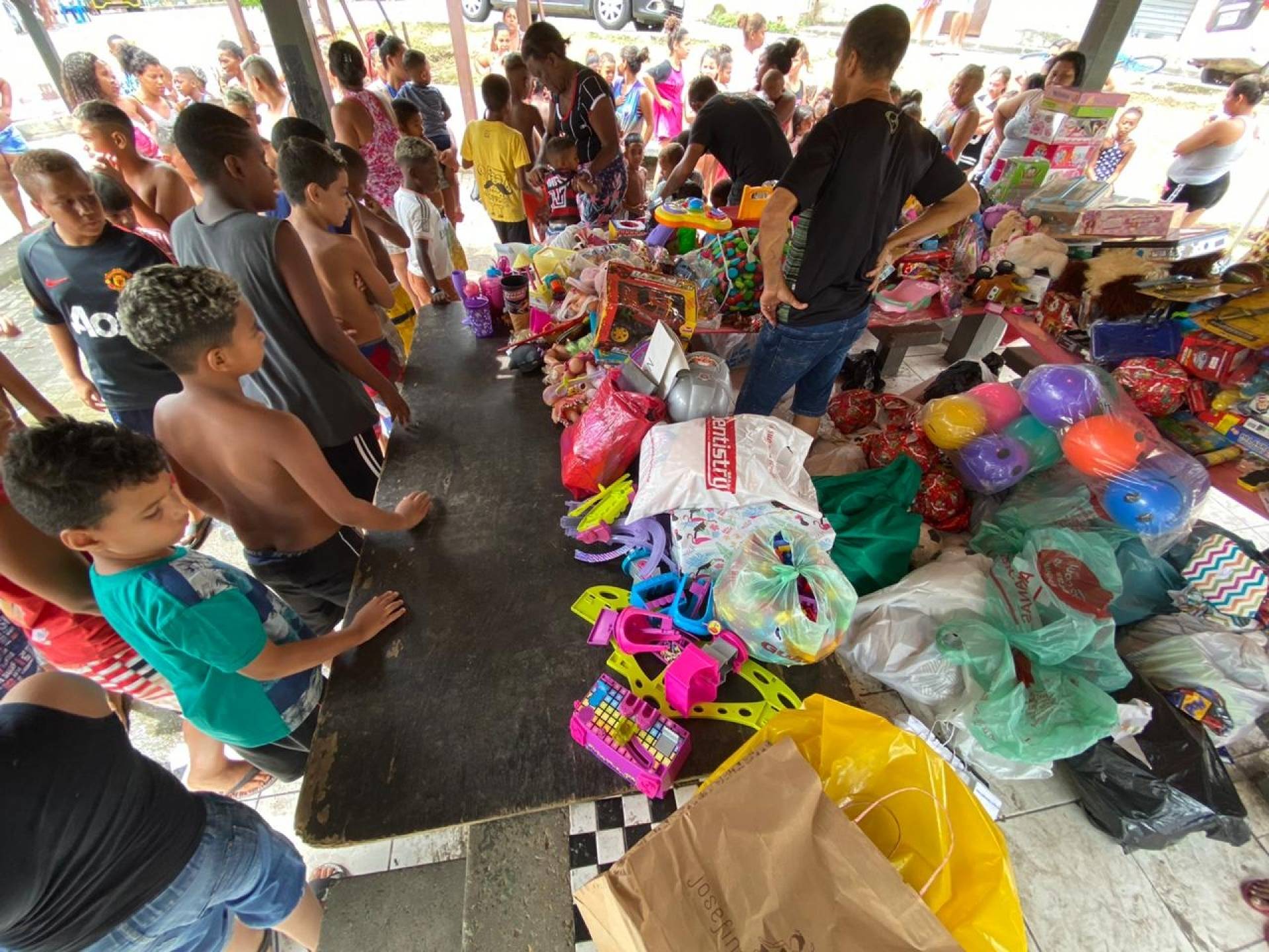 Mãe de Yasmin e Alef Bernardo, Jéssica Ribeiro de Souza, saiu com uma sacola cheia de brinquedos. "Meu filho ganhou um carrinho enorme e minha filha também ganhou várias coisas. Agora, eles têm brinquedos para brincar no Natal. Antes, não tinha", comemorou ela.