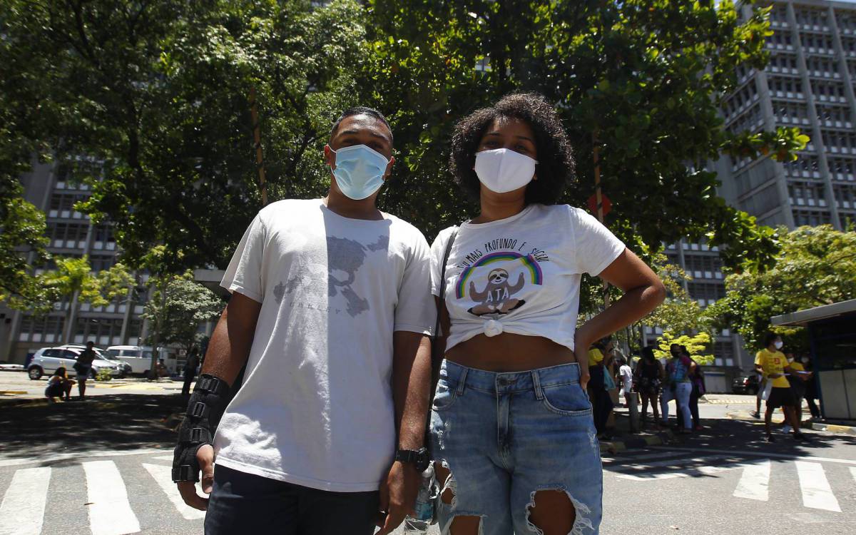 Alunos de uma escola particular no Méier, o casal Vivian Rajão do Amaral, 17, e Marcos Cavalcante Lopes Silvestre, 18, se formaram no ensino médio em 2020, e foram até a UERJ para realizar o exame. Na tentativa de ingressar nos cursos de medicina e direito, respectivamente, os dois puderam ainda fazer cursos pré-vestibulares.
