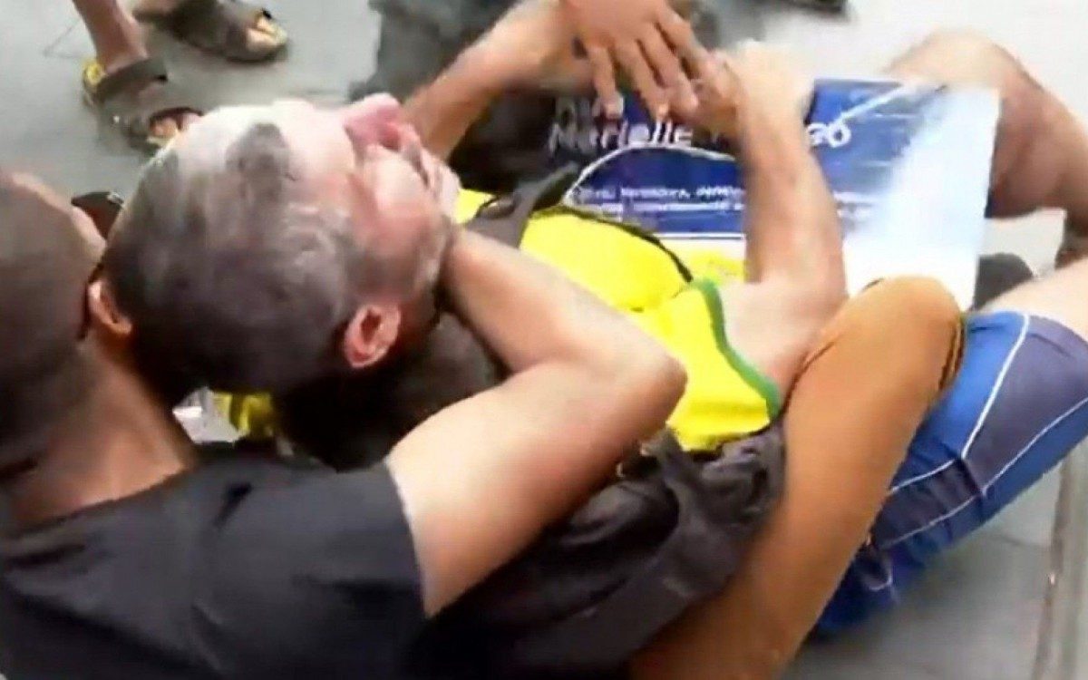 Enquanto os apoiadores gritavam o nome do deputado, um homem arrancou a placa das mãos do dono da placa. A vítima estava com a perna imobilizada e andando de muletas, e jogou o objeto para o alto. Ele foi atirado ao chão após receber um golpe mata-leão.