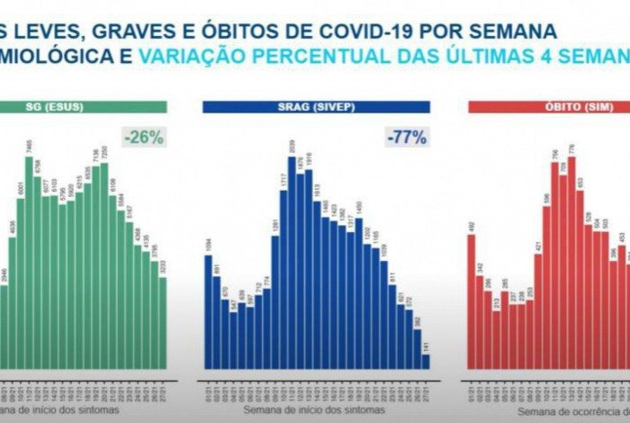 Ocorrências de óbitos por covid-19 caíram 79%, Síndrome Respiratória Aguda Grave caíram 77% e as de Síndrome Gripal, 26%. Dados são do 28° Boletim Epidemiológico do RioReprodução