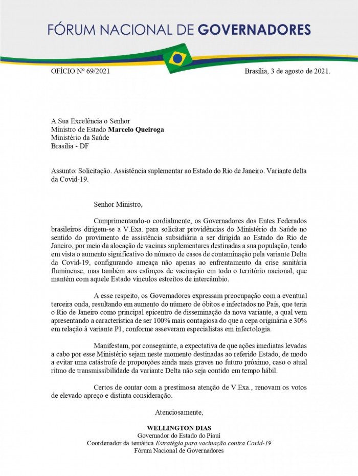 Na terça-feira (3), o Fórum dos Governadores enviou um ofício ao Ministério da Saúde pedindo que mais vacinas fossem redistribuídas para o Rio de Janeiro. O ofício foi assinado pelo governador do Piauí, Wellington Dias (PT), e foi documentado formalmente a preocupação de todos os demais estados com a possibilidade de uma terceira onda nacional da covid-19 com o estado fluminense sendo o epicentro dos casos da variante Delta.