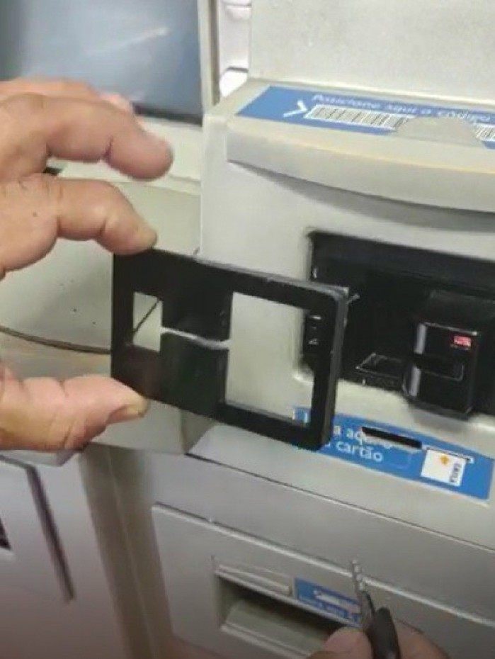"Se ele (cliente) colocar o cartão dele, o cartão vai entrar e ele não vai conseguir retirar. Automaticamente, terá uma pessoa aqui dentro para oferecer ajuda, principalmente aos idosos. Não aceite ajuda com esse tipo de sistema aqui", recomenda o agente, mostrando como é o equipamento usado para cometer a fraude.