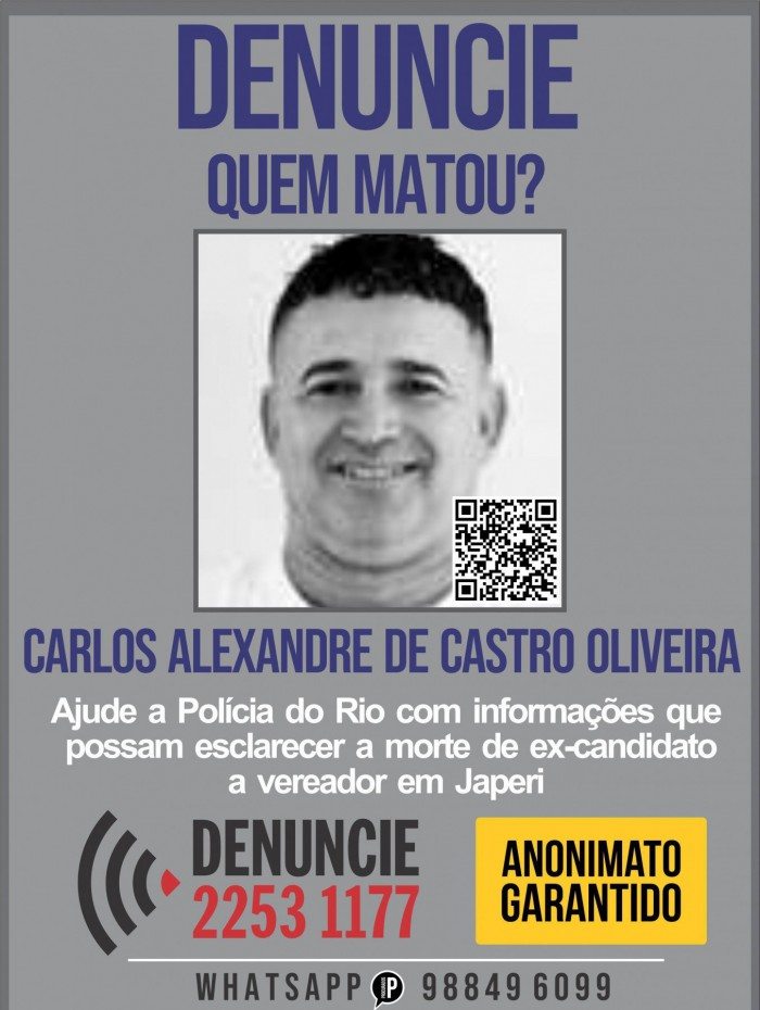 Rio - O Portal dos Procurados divulgou nesta quinta-feira (19) um cartaz pedindo informações, sobre os suspeitos de assassinarem o ex-candidato a vereador e ex-secretário por Japeri, na Baixada Fluminense, Carlos Alexandre de Castro Oliveira, de 44 anos. O corpo dele foi encontrado com várias marcas de tiro, nesta quarta-feira (18), dentro de um ferro velho na Rua Engenheiro Rademaker, no bairro Maria José, em Japeri.