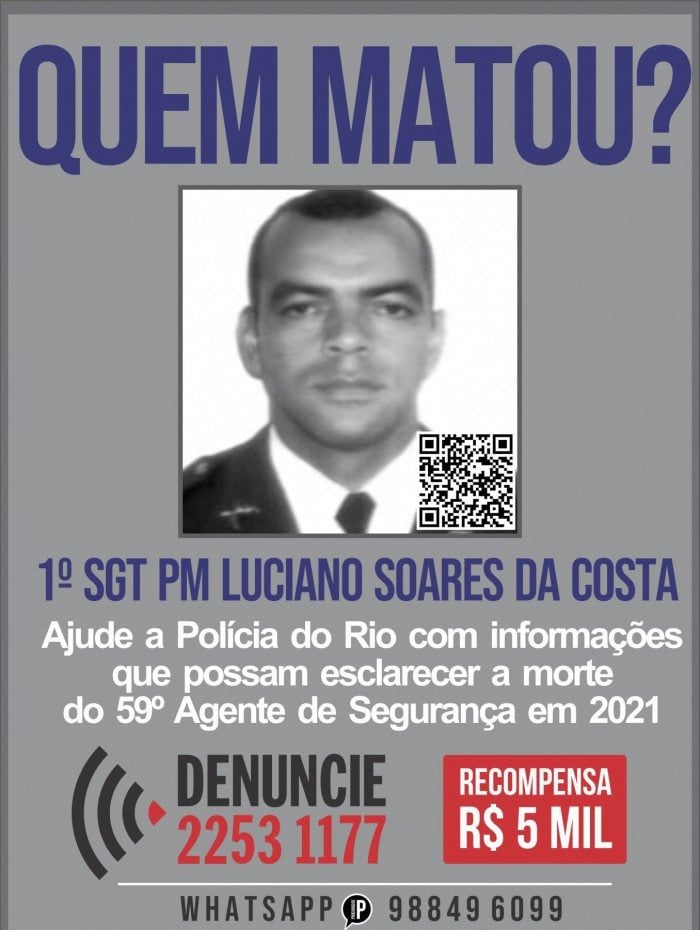 Rio - O Disque De núncia divulgou, nesta sexta-feira, um cartaz que pede ajuda na identificação dos envolvidos em troca de tiros que matou um sargento da PM, um jovem de 26 e feriu outro policial, nesta sexta-feira, em Duque de Caxias, na Baixada. Luciano Soares da Costa morreu baleado com um tiro na cabeça enquanto tentava impedir um assalto a carro forte, na Av. Presidente Kennedy, em Gramacho. O enterro de Luciano confirmado para a tarde deste sábado, no Memorial Parque Nycteroy, no Laranjal, em São Gonçalo, na Região Metropolitana.