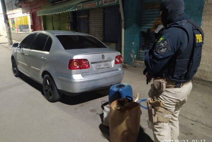 Na abordagem, encontraram os 100 litros de combustível divididos em dois galões, além de bomba de compressão, maleta de ferramentas e canos de borracha.