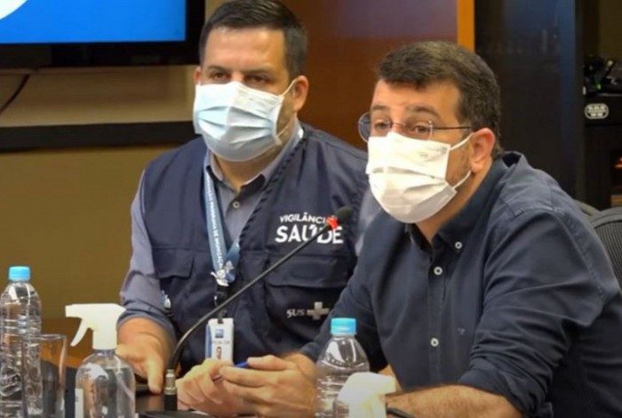 Secretário municipal da Saúde, Daniel Soranz, ao lado do subsecretário de Vigilância em Saúde, Marcio Garcia, durante a divulgação do 35° Boletim Epidemiológico do Rio Reprodução