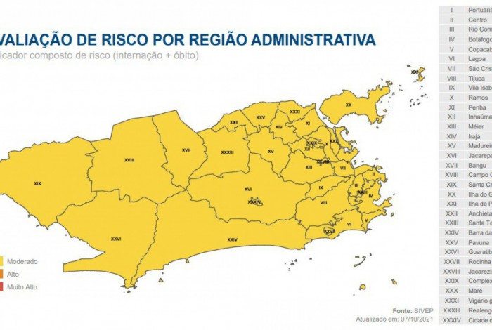 A Prefeitura colocou todos as regiões administrativas do Rio em amarelo na avaliação de risco (internação + óbito), pela terceira semana seguida. O amarelo, que significa patamar moderado, é o menos grave dos três indicadores - alto (laranja) e muito alto (vermelho).