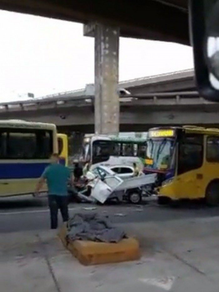 Em imagens que circularam nas redes socais, era possível ver o veículo completamente destruído prensado entre os dois coletivos.