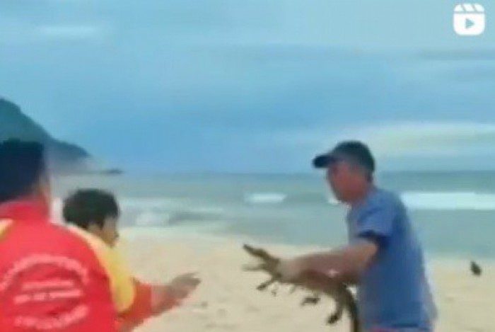 Homem usa jacaré durante discussão na Praia da Macumba, Zona Oeste do RioReprodução / Redes sociais