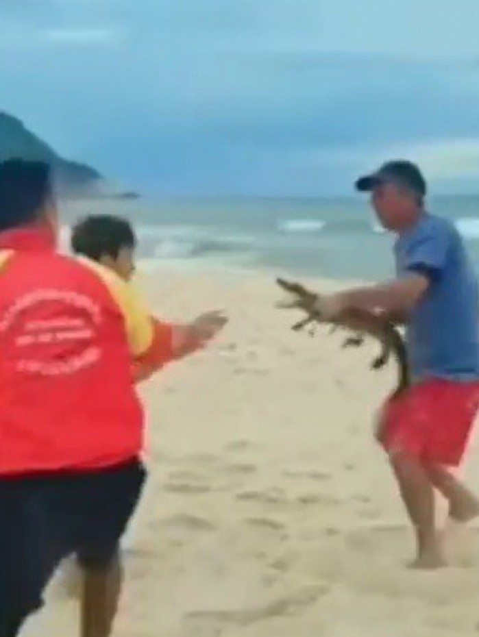 Na filmagem, um guarda-vidas do local tenta apartar a briga, mas não consegue. A Defesa Civil informou que logo após o ocorrido, o jacaré foi capturado e solto no Parque Natural Municipal de Marapendi.
