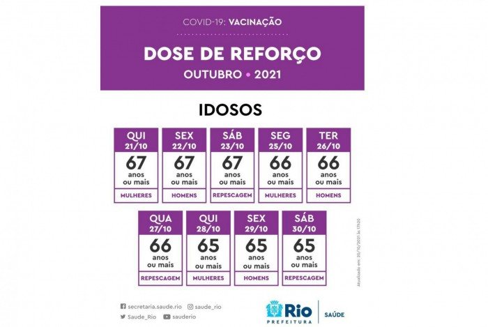 Na quinta-feira (28), são vacinadas mulheres com 65 anos ou mais. Na sexta (29), homens com 65 anos ou mais. No sábado ocorre novamente uma repescagem, só que desta vez, para pessoas com 65 anos ou mais.