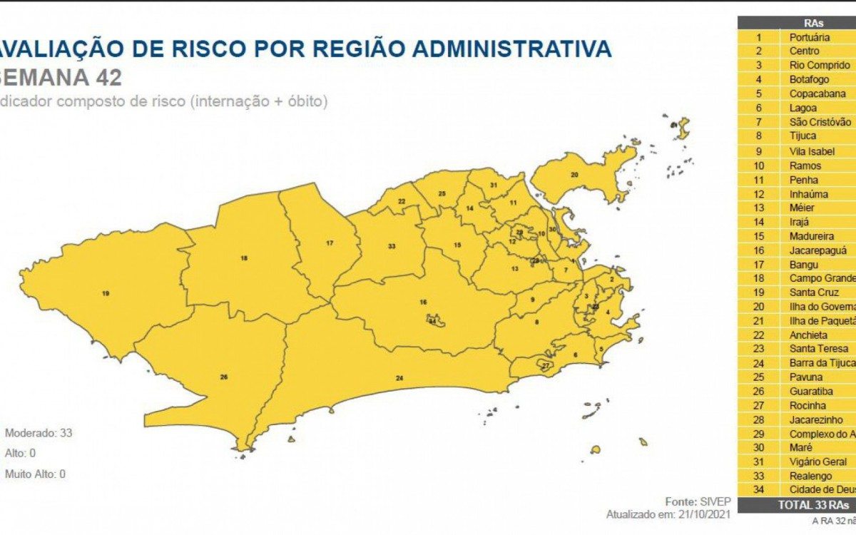 Rio - A Prefeitura do Rio informou, através do 42ª Boletim Epidemiológico, que a cidade está com risco moderado para a covid-19 pela quinta semana consecutiva. De acordo com o documento, todas as 33 regiões administrativas seguem na cor amarela, a menor na avaliação de risco, que considera os números de internações e óbitos. O indicador é o menos grave dos outros três - alto (laranja) e muito alto (vermelho).