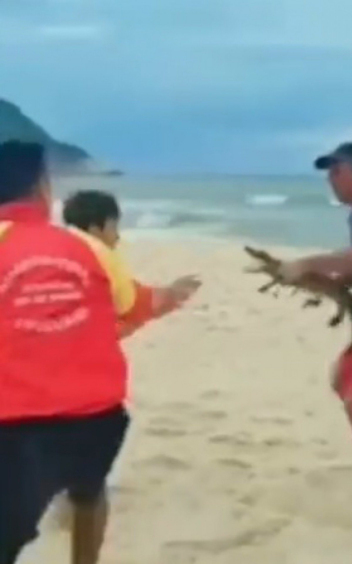 Na filmagem, um guarda-vidas do local tenta apartar a briga, mas não consegue. A Defesa Civil informou que logo após o ocorrido, o jacaré foi capturado e solto no Parque Natural Municipal de Marapendi.