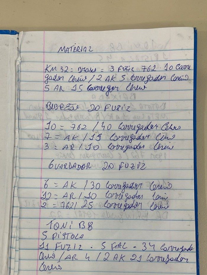 Nas páginas, Tandera fez anotações de como distribuiu parte de seu arsenal: há uma lista com 97 fuzis e os nomes dos bandidos que estão com as armas. Também há o registro se os carregadores estão cheios ou não e o modelo de cada fuzil. Entre eles, há 15 unidades do AR10 -- utilizado por atiradores de elite.