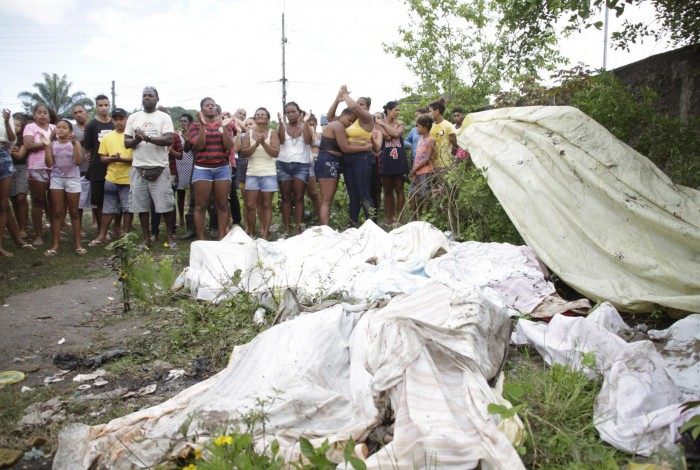 Na manhã desta segunda-feira, moradores retiraram oito corpos de um mangue, na localidade da Palmeira. Segundo eles, a noite de sábado e o domingo foram marcados por intensos tiroteios e os homens foram mortos pelos PMs numa área de mata da região.