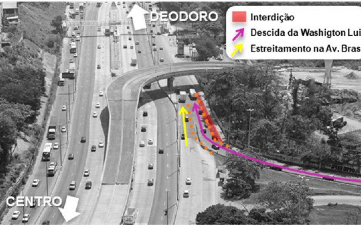 Na altura de Ramos, para serviços de drenagem, a mudança está prevista para começar somente na próxima segunda, 8, e deve terminar até sexta-feira da semana que vem, 12. O esquema será a interdição de uma faixa (lado direito) da pista central da Av. Brasil, sentido Deodoro, entre a Rua João Araújo e a Rua Ari Leão.