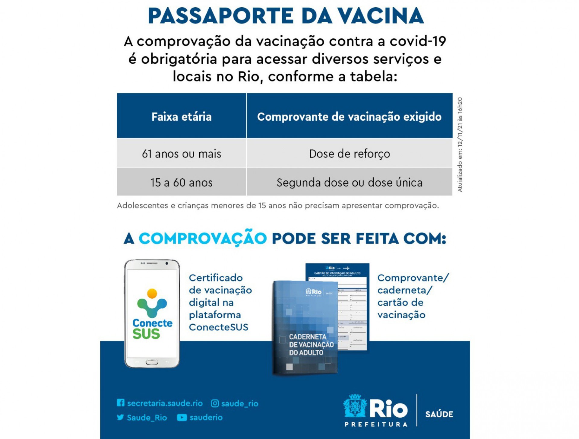 A comprovação da situação vacinal pode ser feita com o certificado de vacinação digital disponível na plataforma ConecteSUS ou com comprovante, caderneta ou cartão de vacinação.
