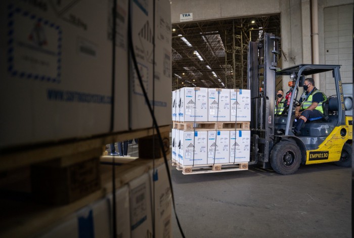 Chegada do primeiro lote de doses pediátricas de vacina contra a covid-19 da Pfizer/BioNTech no Brasil. Ministério da Saúde é o responsável pela distribuição aos estadosDivulgação/Myke Sena
