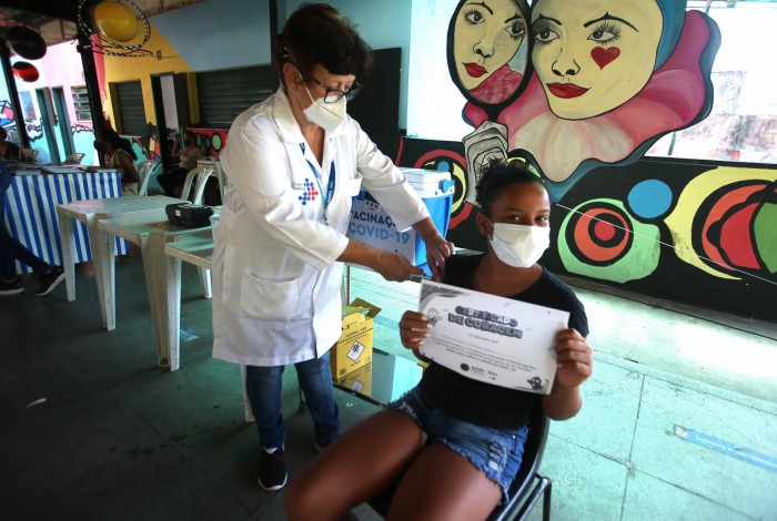Vacinação na lona cultural João Bosco, em Vista Alegre. Na foto, Luiza Marques, de 11 anosCleber Mendes/Agência O Dia