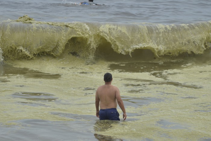 Poucas pessoas se arriscaram a entrar no mar. Fenômeno foi provocado por floração de algas, segundo o Inea
