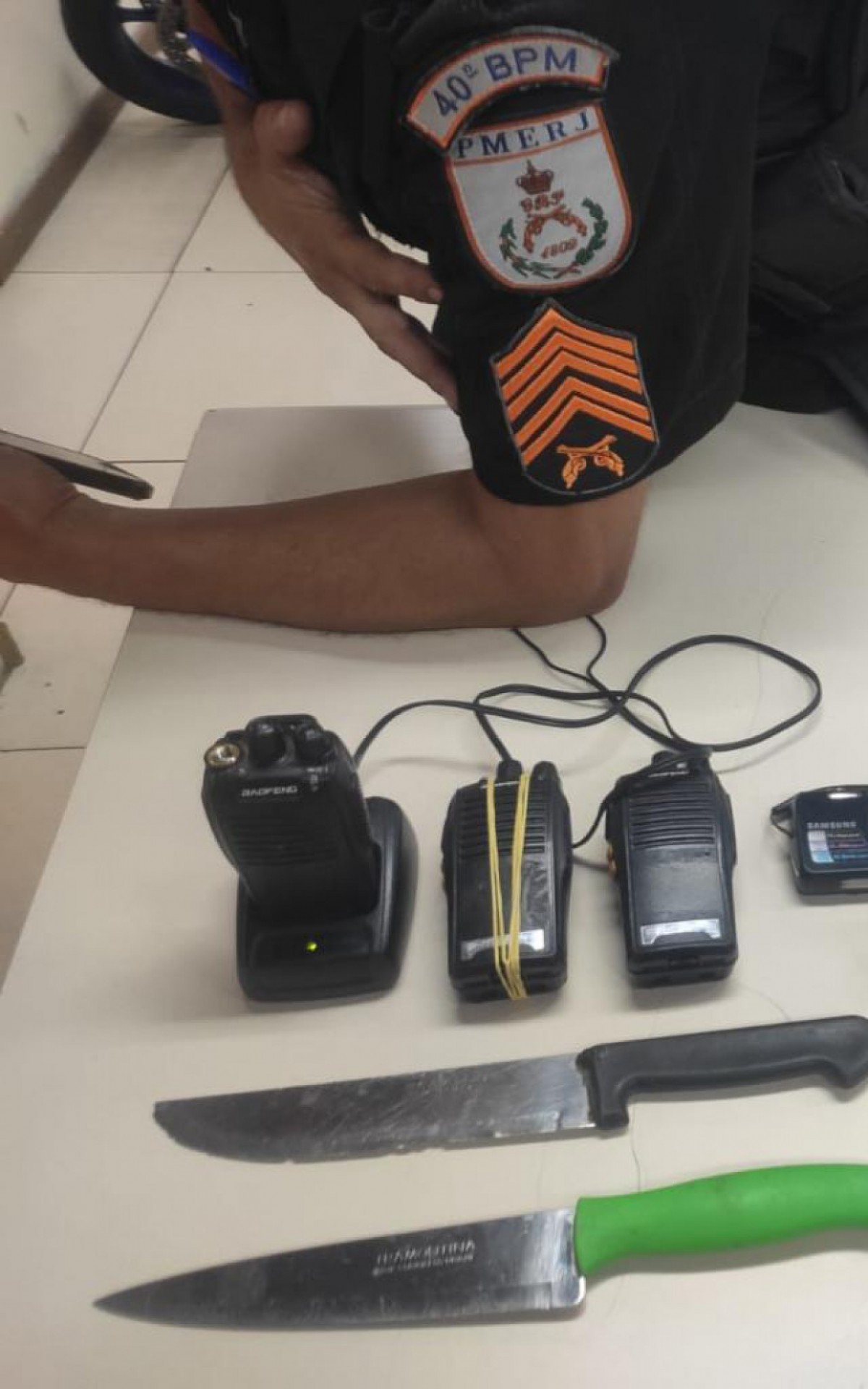 De acordo com a PM, equipes do 40° BPM (Campo Grande) foram até a Rua Major José Tinoco para checar a a denúncia de um veículo localizado. A moto roubada foi encontrada no quintal de uma residência no endereço da denúncia. Na casa, além de prender um dos assaltantes, os policiais apreenderam as facas utilizadas no crime, uma simulacro de pistola e três rádios comunicadores.
