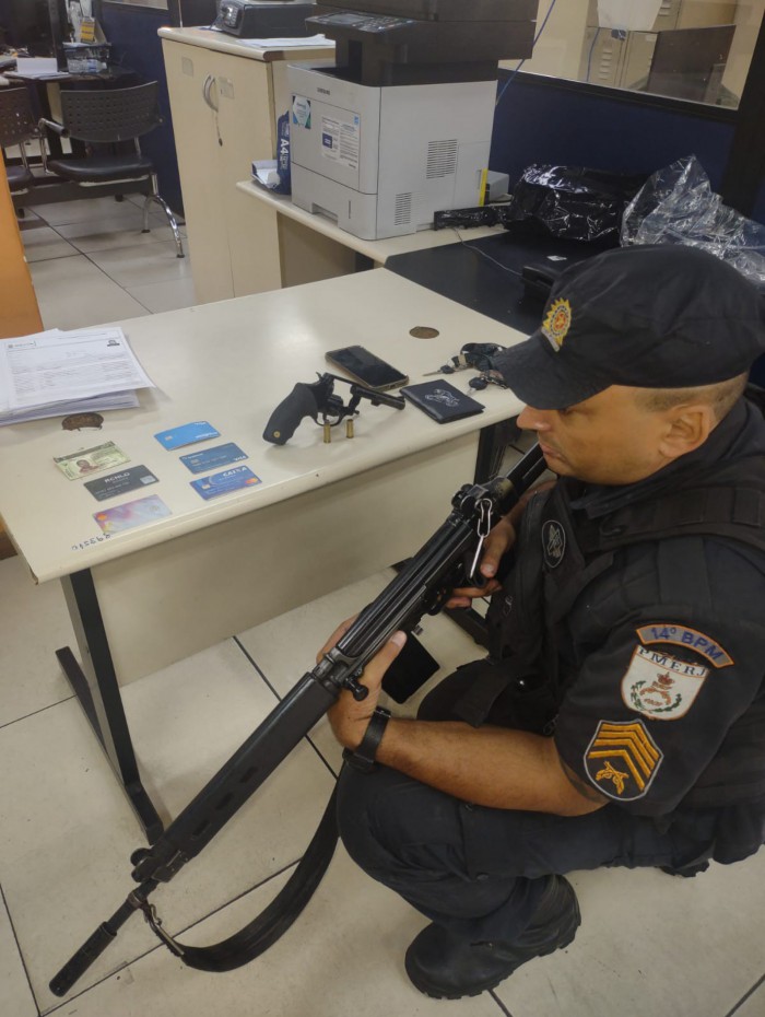 Com a dupla, policiais militares apreenderam um revólver calibre 38, uma munição, além de diversos documentos de terceiros e um aparelho celular roubado