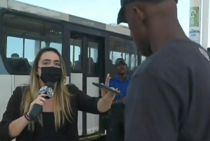 A jornalista do SBT, Branca Andrade, teve o trabalho interrompido pela dupla, que não tinha identificação, no terminal Alvorada, na Barra da Tijuca, Zona Oeste do Rio