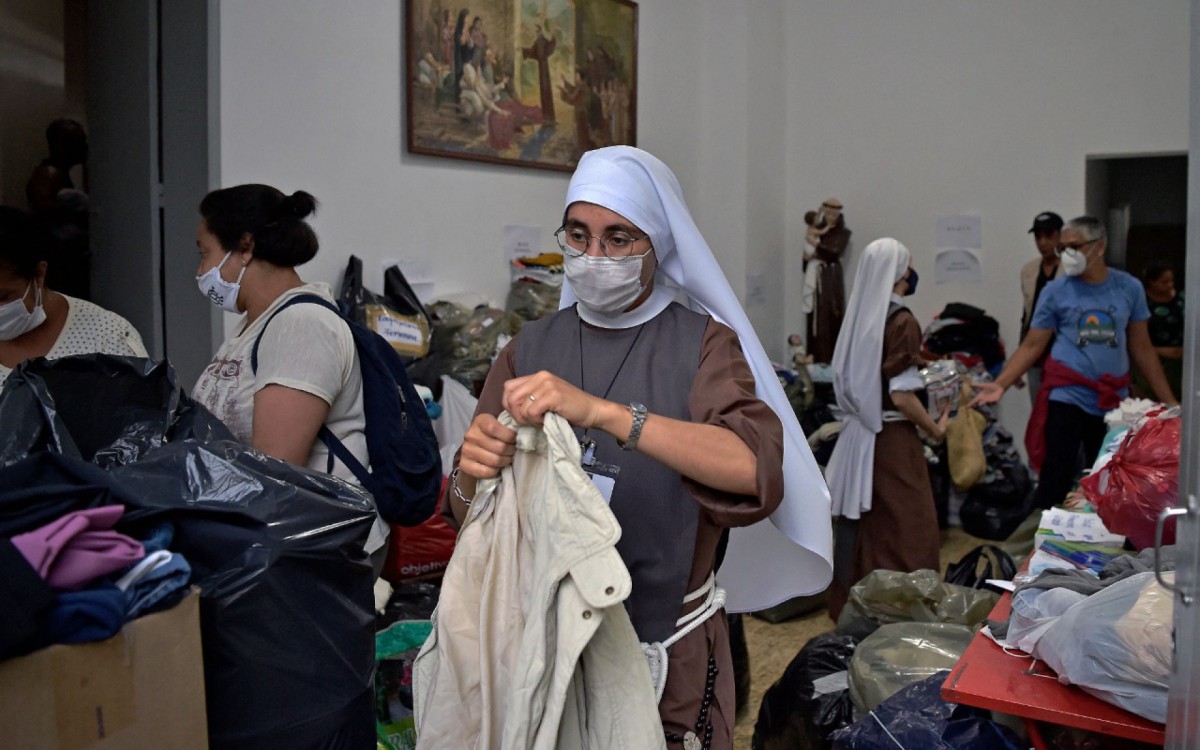 Em frente ao local, uma longa corrente humana transporta pacotes de água engarrafada de mão em mão, em alta velocidade. Lá dentro, o chão está repleto de roupas, alimentos, produtos de higiene, fraldas e inúmeros produtos destinados àqueles que perderam tudo. "Quando aconteceram os deslizamentos de terra, nós e muitos outros corremos para ajudar as pessoas presas na lama e nos escombros", conta Vasconcellos, de 28 anos.
