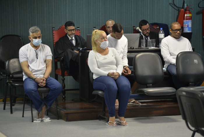 Julgamento sobre a morte do Pastor Anderson do Carmo, no tribunal do Júri, em Niterói, nesta terça-feira (12). Na foto, da esquerda para direita, o ex-PM Marcos Siqueira Costa, sua esposa, Andrea Santos Maia, filho biológico de Flordelis, Adriano dos Santos Rodrigues e o filho afetivo de Flordelis, Carlos Ubiraci Francisco da Silva. Fabio Costa/ Agência O Dia