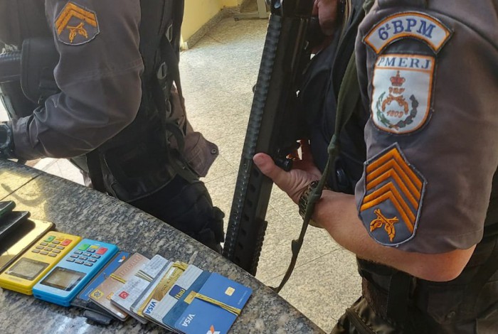Com a dupla, os policiais militares apreenderam 27 cartões, duas máquinas de cartão e três celulares