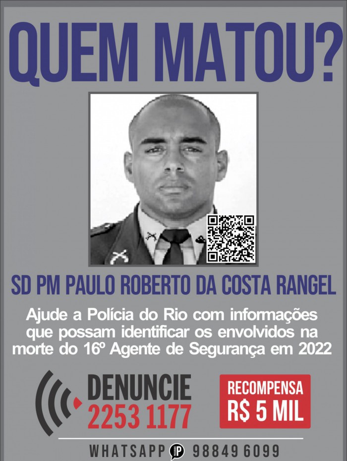 Rio - O Portal dos Procurados divulgou, nesta segunda-feira (25), um cartaz para ajudar nas investigações da Delegacia de Homicídios da Baixada Fluminense (DHBF) que possam levar à identificação e prisão dos envolvidos na morte do soldado da Policia Militar Paulo Roberto da Costa Rangel. O agente tinha 35 anos e foi assassinado nesta madrugada na saída de um pagode em Belford Roxo.