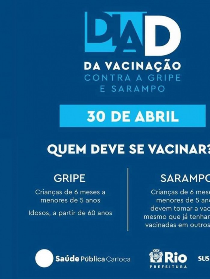 Rio - A Prefeitura do Rio realiza, neste sábado (30), o dia D de vacinação dos idosos contra a gripe e das crianças contra a gripe e o sarampo. Serão mais de 430 pontos de imunização contra as doenças em toda a cidade, das 8h às 17h. De acordo com a Secretaria Municipal de Saúde (SMS), as crianças com idade entre seis meses e 4 anos poderão receber as duas vacinas. A população de crianças na cidade dentro da faixa etária indicada é estimada em 353 mil.