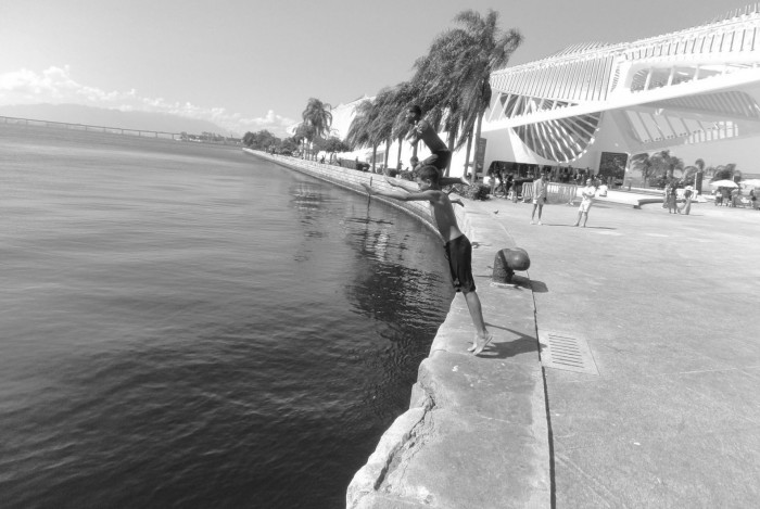 É da sua autoria de Santos a foto com o garoto prestes a mergulhar nas águas da Baía de Guanabara, diante do Museu do Amanhã. “Quando fiz as fotos, foi um dia maravilhoso e de muito calor. As crianças estavam pulando e eu pedi para tirar fotos delas”, lembrou o ex-morador de rua que, atualmente, conseguiu emprego na Revista Traços e é porta voz cultural da publicação.